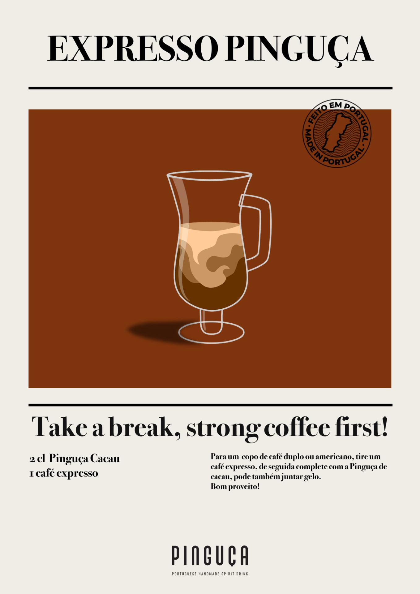 Servir Café Expresso num copo de 250ml. Juntar 20 cl Pinguça Cacau. Mexer/Juntar suavemente. Servir.