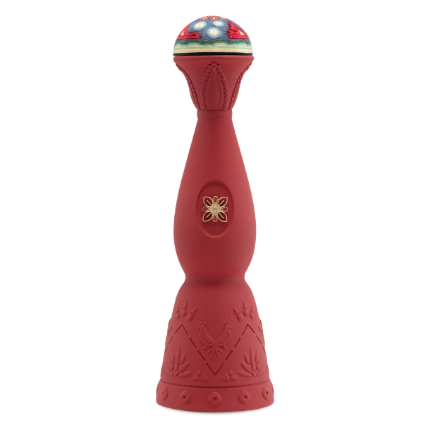 • Garrafa decorativa vermelha com padrões em relevo e topo colorido floral